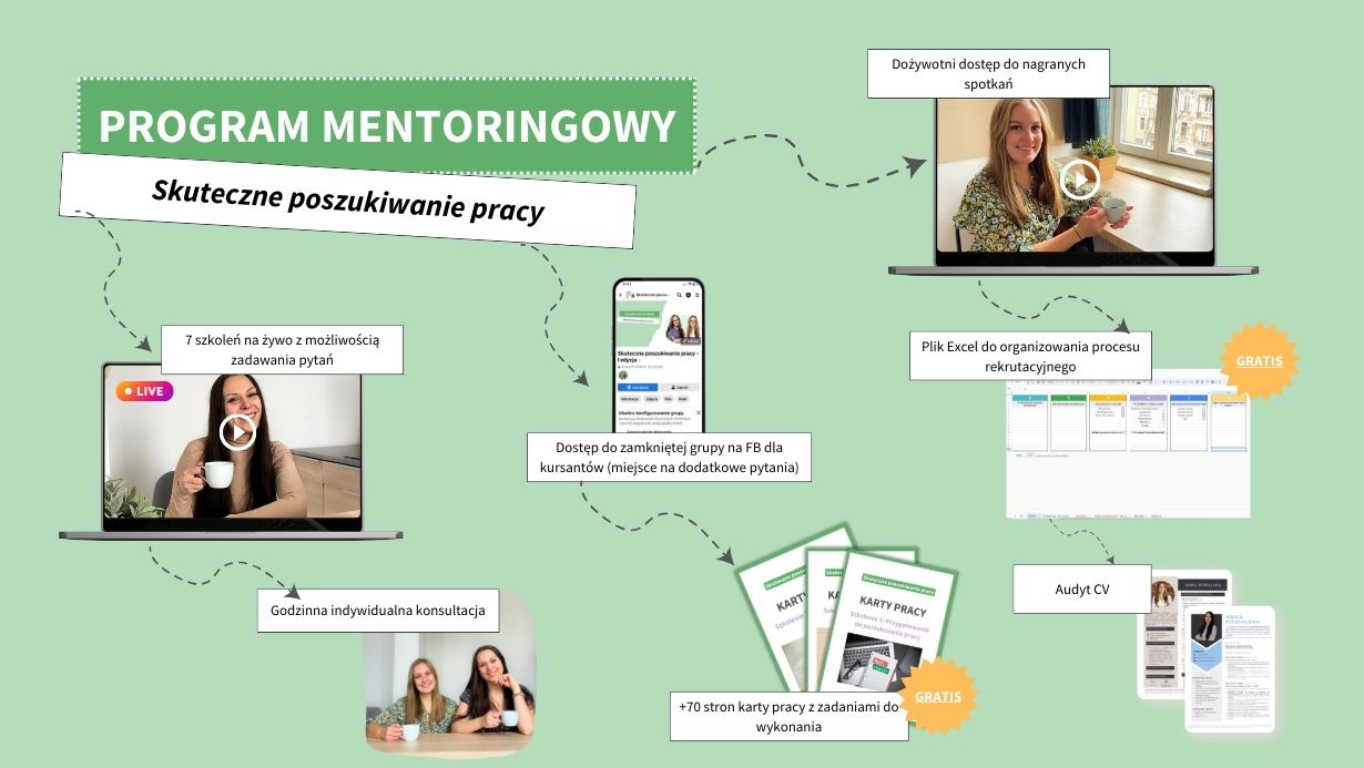 Wykupując udział w programie mentoringowym otrzymasz dostęp do platformy, na której będą znajdować się wszystkie nagrane szkolenia, karty pracy oraz dodatkowe materiały.